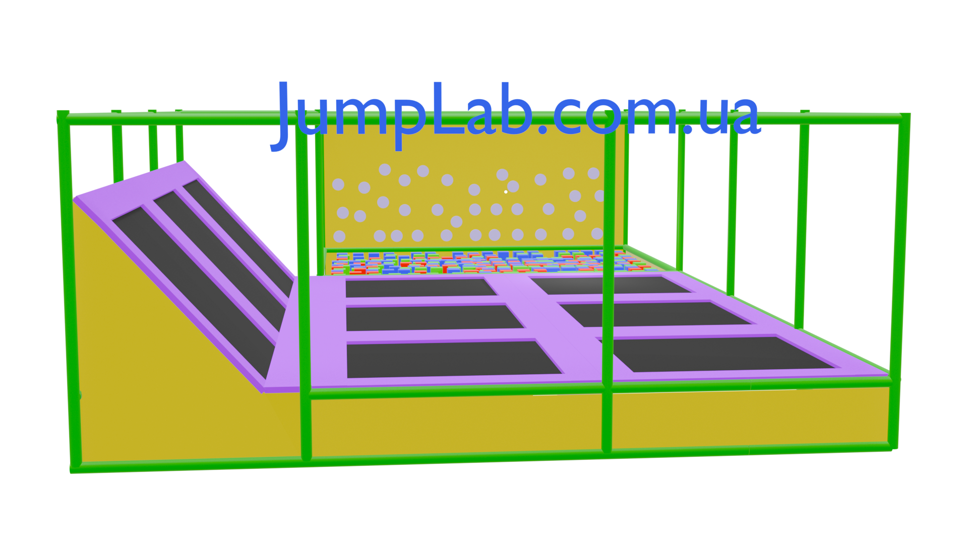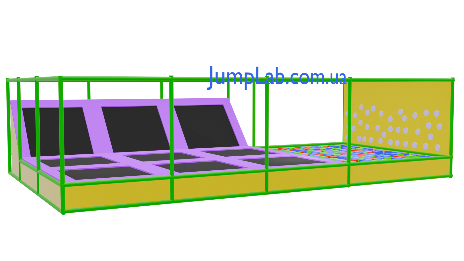 Батутна арена Стандарт JampLab – це професійна батутна арена середнього розміру з батутами, скеледромом та ігровою зоною. Включає яскраву ігрову зону з кольоровими елементами, металеву конструкцію зеленого кольору, фіолетові захисні мати та стінки. Підходить для дітей та дорослих, призначена для батутних парків та розважальних центрів.